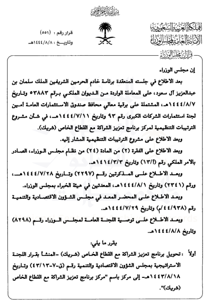Organizational Arrangements for the Private Sector Partnership Program (shareek) Center for the year 1444H